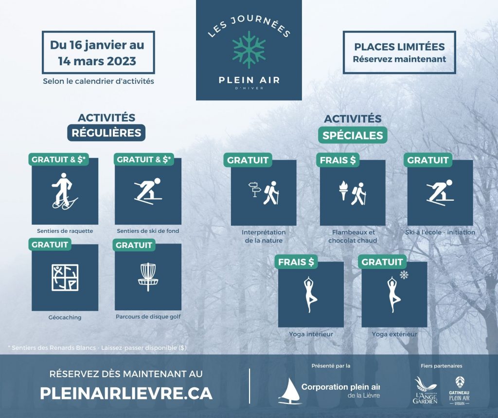 La Corporation plein air de la Lièvre (CPAL) est heureuse de présenter sa programmation hivernale, les Journées plein air d’hiver 2023, qui débutera le 16 janvier prochain. S’échelonnant sur neuf (9) fins de semaine, elle permettra autant aux petits qu’aux plus grands d’en profiter pleinement ! En collaboration avec la Municipalité de L’Ange-Gardien et la Ville de Gatineau, la CPAL est fière de rendre accessible et de favoriser les activités en plein air pour tous. Les activités régulières continueront cet hiver (randonnée en raquette et ski de fond aux Renards Blancs entre autres), mais de nouvelles activités viendront s’y greffer cette année ! Les places seront limitées pour certaines d’entre elles, il ne faut pas tarder afin de réserver sa participation.