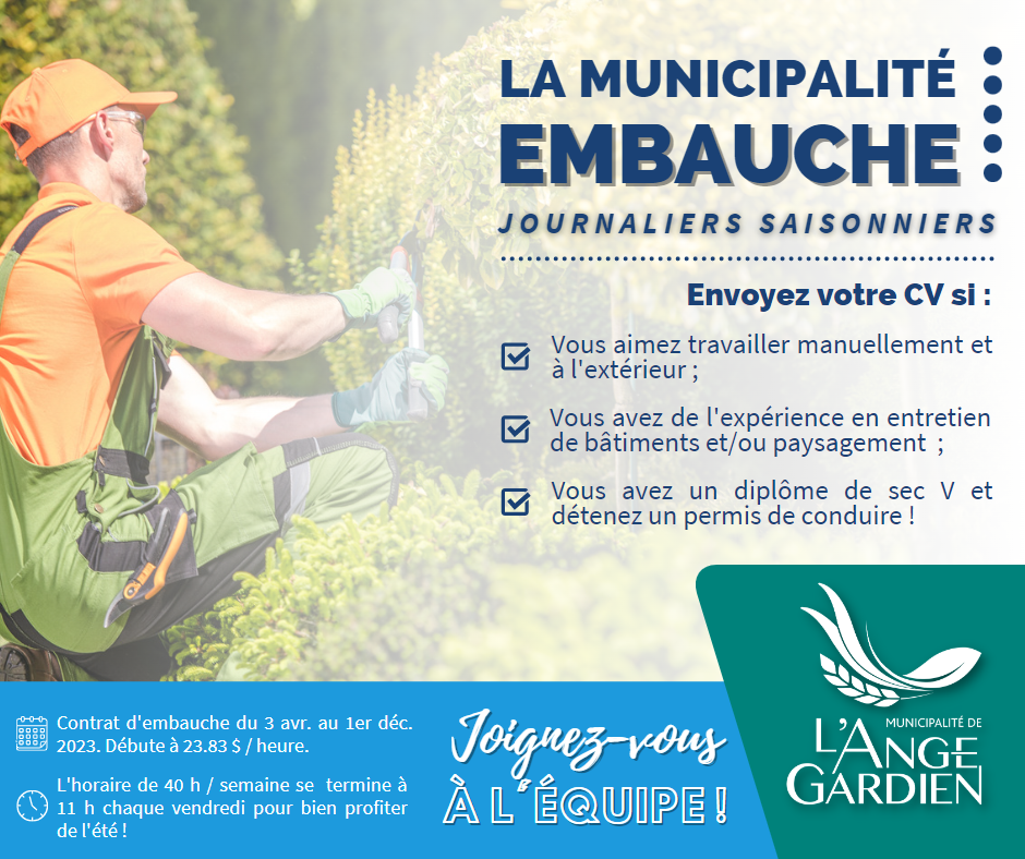 Les gens intéressés à postuler peuvent envoyer leur CV et lettre de motivation à Mme Maude St-Amour, directrice des services administratifs, via le mstamour@municipalitedelangegardien.com, et ce, jusqu’au 3 juin 2022.
